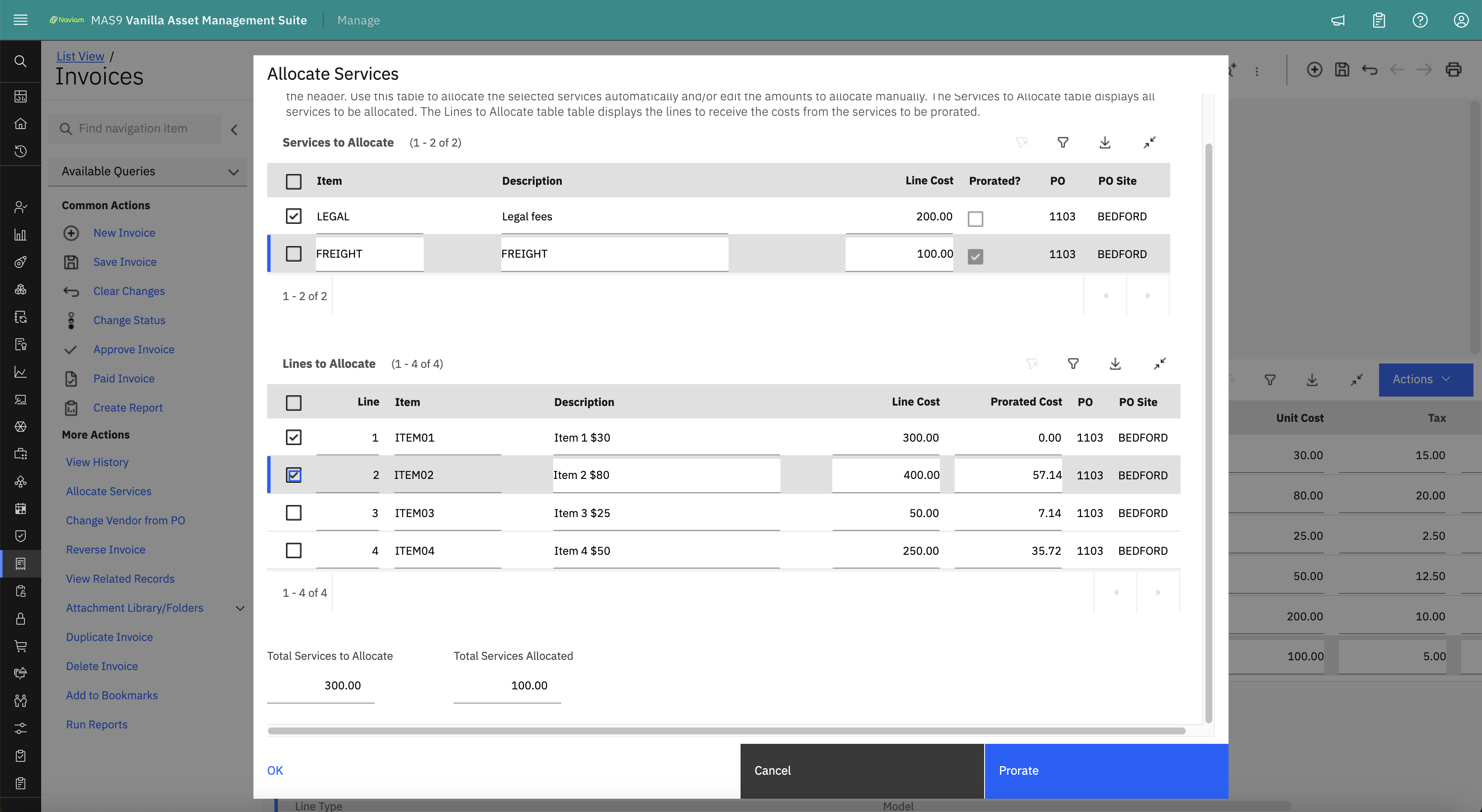 - You can allocate multiple Standard Services with Prorate Service set. We will allocate $100 of FREIGHT services and $200 of LEGAL fees, a new Service Item that I have created.